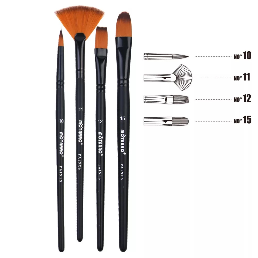 A Prémium Motarro fekete színű ecsetkészlet 4 különböző méretű ecsetet tartalmaz, melyek lehetővé teszik a tökéletesen precíz festékfelvitelt a vászonra, kezdve a legapróbb részletektől a nagyobb felületekig. Méretek: 10, 11, 12, 15. Tökéletes választás akril, olaj, tempera vagy akár akvarell festményekhez.