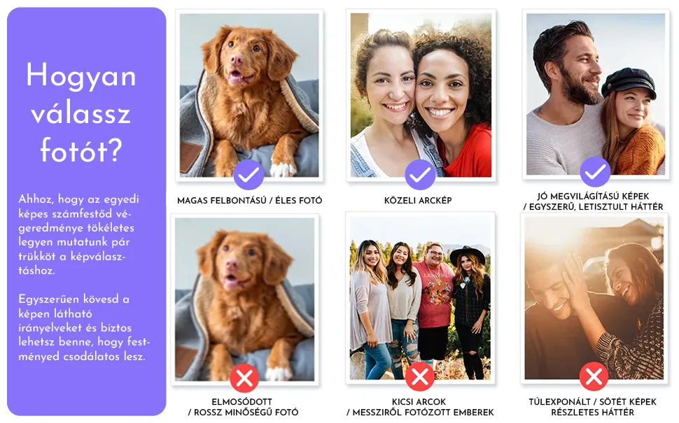 Jó ötlet olyan fotót választani, amelynek a háttere nem túl részletgazdag és rendetlen. A nagyobb képhűség végett, azt tanácsoljuk válassz kevesebb arcot tartalmazó fotókat. Ha például családi fotót szeretnél festeni, kerüld, hogy 4-5 embernél több szerepeljen rajta, így a festményen majd jól látható lesz az arcuk. A legszebb eredményt a jó minőségű, közeli, jó megvilágítású fényképek adják. Ne feledd, hogy miután a feltöltött fotót átalakítjuk számfestő mintává, az kevésbé lesz részletes, mint az eredeti fotó.
