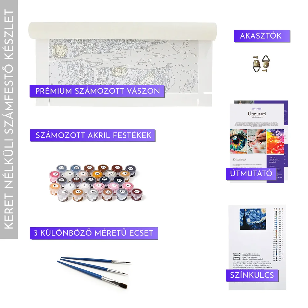 Minden számfestő készlet a festéshez szükséges összes tartozékot tartalmazza: a festővásznat, festékeket, ecseteket és a referenciaképet is, így kézhezvétel után azonnal nekiláthatsz a festésnek.